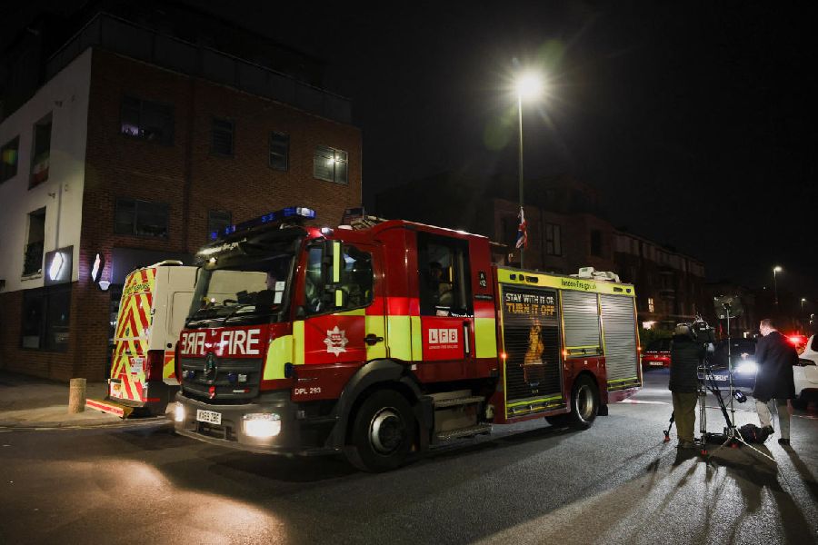 A fire engine leaves the scene after four ambulances belonging to Hatzola, a Jewish community organisation, were set on fire in an incident that the police say is being treated as an antisemitic hate crime, in northwest London, Britain, March 23, 2026.