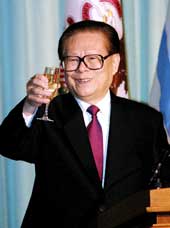 | Chinese President Jiang Zemin raises a toast during a dinner in Chicago on Tuesday. (AFP) |