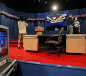 | Technicians work on the debate floor at the University of Miami convocation centre in Coral Gables, Florida. (AFP) |