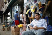 | Sadiqul Haque sells merchandise on the street outside his father’s store inthe New York borough of Queens despite the blackout. (AP) |