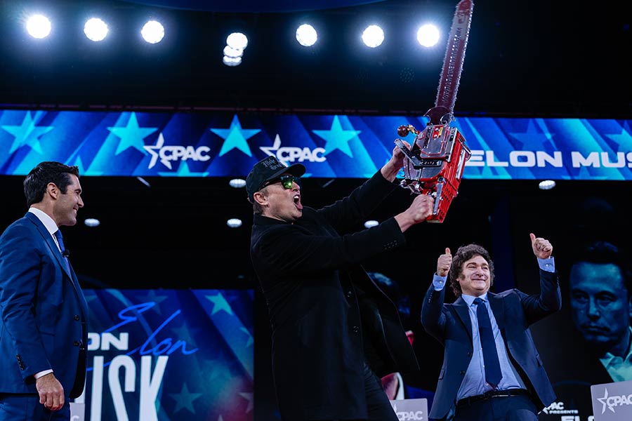 As he walked onto the stage, he was handed a chain saw from one of his political allies, Javier Milei, the president of Argentina. “This is the chain saw for bureaucracy!” Musk shouted to the cheering crowd.