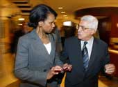 | Palestinian Prime Minister Mahmoud Abbas (right) with US national security adviser Condoleezza Rice in the West Bank town of Jericho on Saturday. (AFP) |