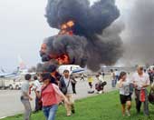| Terror-stricken passengers flee from the burning aircraft at Naha airport on the Japanese island of Okinawa on Monday. (Reuters) |