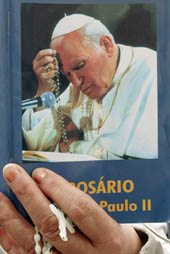 | A Catholic holds a Pope John Paul book in central Portugal. (Reuters) Polish pilgrims pray at a mass in Rome. (Reuters) |