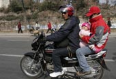 | A family takes a ride on a motorcycle during the transport strike in Kathmandu on Monday. (Reuters) |