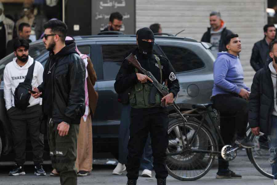 A security member loyal to the new Syrian administration holds a weapon as people protest against the killing of civilians and security forces. (Reuters)