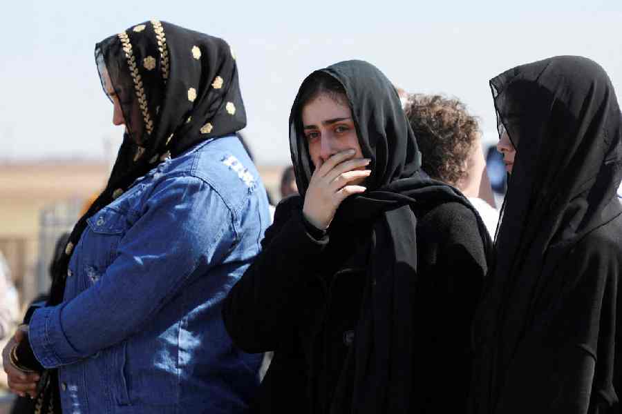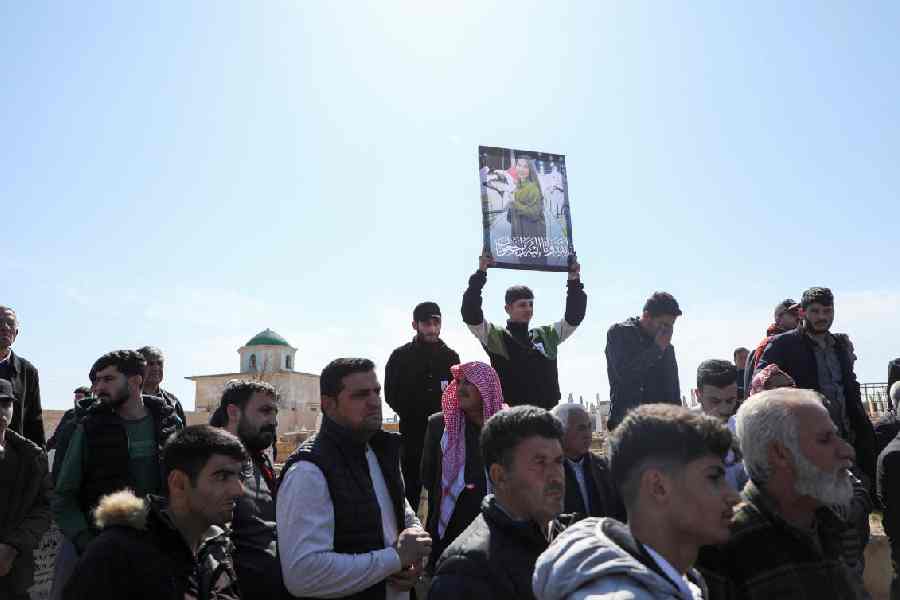 Mourners gather during the funeral of Shinda Kisho who was killed in Latakia, in Qamishli (Reuters)