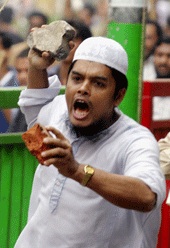 | A Jamat-e-Islami supporter hurls stones at Awami League activists during a clash in Dhaka on Saturday. (Reuters) |