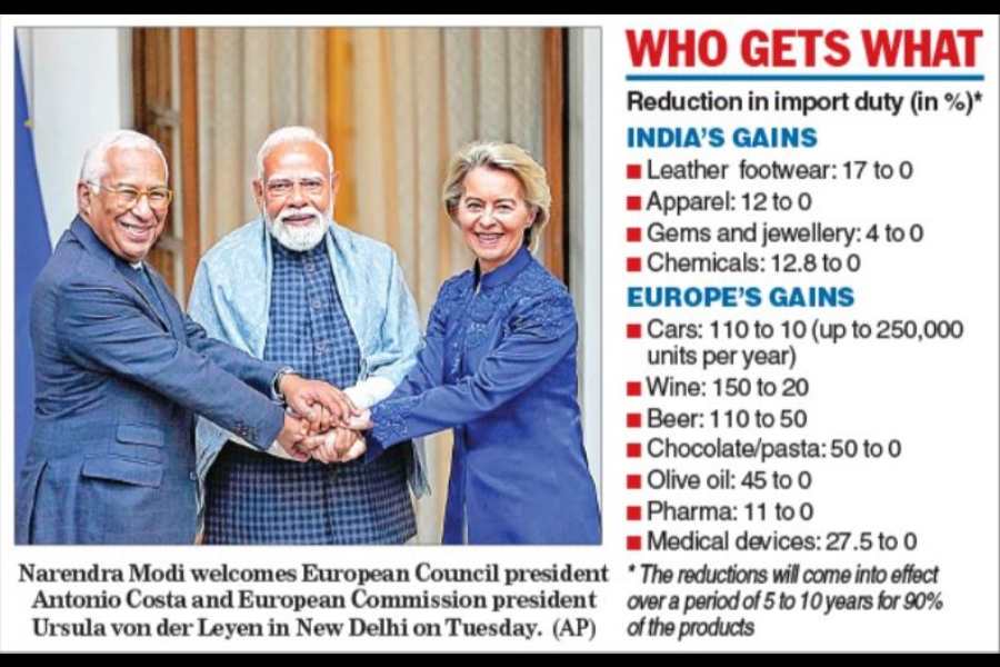 Von der Leyen said in her remarks to the media at Hyderabad House: “Two giants who choose partnership, in a true win-win fashion. A strong message that cooperation is the best answer to global challenges…. It brings together India’s skills, services and scale, with Europe’s technology, capital and innovation. It will create levels of growth that neither side can achieve alone. And by combining these strengths, we reduce strategic dependencies, at a time when trade is increasingly weaponised.”