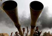 An Iraqi girl approached the tank with a loaded gun, (AFP picture on the left) which was gutted by fire, with ammunition belts scattered on the ground. Iraqi officers said the other seven US tanks had been destroyed and removed from the battlefield. This correspondent saw six or seven burnt Iraqi vehicles at the site. Some men also flashed victory signs atop anti-aircraft guns yesterday (Reuters picture on the left) on the southern outskirts of Baghdad.