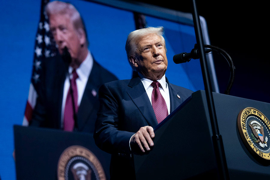 President Donald Trump delivers remarks at the America Business Forum at the Kaseya Center in Miami, on Wednesday, Nov. 5, 2025. (Doug Mills/The New York Times)
