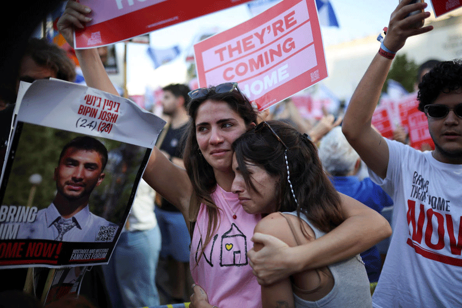 Women react standing next to a poster with the picture of a hostage, Nepalese student Bipin Joshi, at "Hostages Square" on the day Hamas releases Israeli hostages, who have been held in Gaza since the deadly October 7, 2023 attack by Hamas, as part of a prisoner-hostage swap and a ceasefire deal between Israel and Hamas, in Tel Aviv, Israel, October 13, 2025. (Reuters)