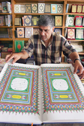 | A shop owner leafs through the pages of a large Quran at his bookshop in Baghdad. (AFP) |