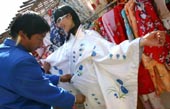 | A photographer dresses a Chinese woman in traditional Japanese clothes in a Beijing park. (Reuters) |